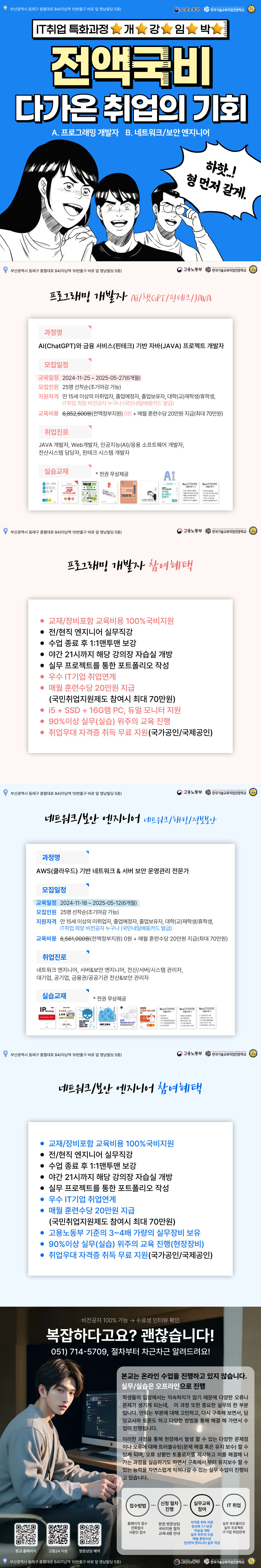 - 기존 전액국비훈련과 다르게 실무프로젝트 및 포트폴리오 작성 교과목이 별도로 잡혀있어 취업에 더욱 유리합니다.(+취업지원)